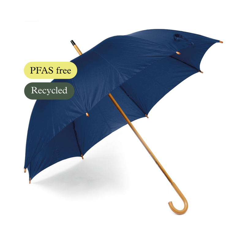 Material PFAS-free, R-PET Pongee, fiberglass ribs, wooden shaft, wooden J- handle