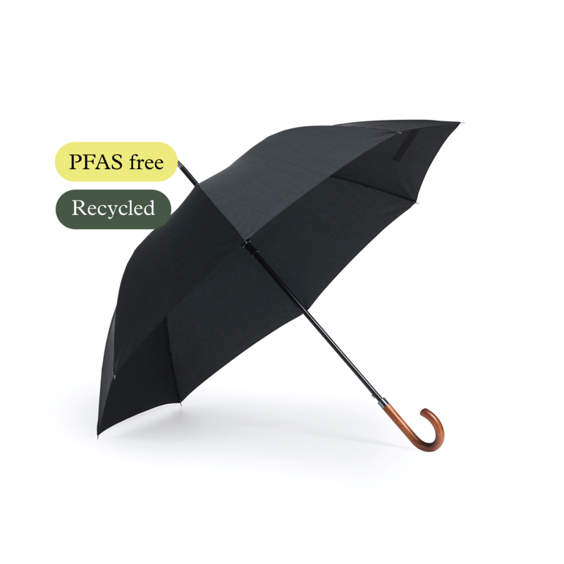 Article No. 20434602NYHET! Grace är ett stilrent paraply med modern teknik och tidlös design. Paraplyet är speciellt eftersom det är helt fritt från PFAS och tillverkat med omsorg om både människa och miljö. Istället för den traditionella behandlingsmetoden för vattenavvisning har vi valt en alternativ metod utan skadliga kemikalier. Paraplyet har paneler av R-PET-tyg, vilket ger ett lägre klimatavtryck och en mer hållbar livscykel. Med sina glasfiberspröt och robusta metalskaft är det både vindtåligt och stabilt, redo att klara även oväntade regnskurar. Det klassiska J-handtaget i trä ger ett säkert och bekvämt grepp, samtidigt som det tillför en elegant touch. Paraplyets stora diameter på 120 cm erbjuder generöst regnskydd, utan att bli otympligt – perfekt som ett mellanting mellan golf- och standardparaply. Med automatisk uppfällning räcker ett tryck för att snabbt öppna paraplyet, vilket gör det smidigt att använda även när du har händerna fulla. Skaft, tippar och topp är i svartlackad metall, vilket ger en stilren och hållbar finish.